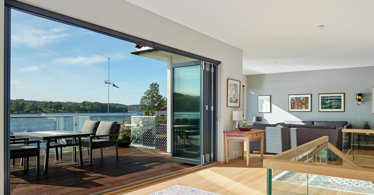 Vi produserer foldedører til kunder som ønsker maksimal åpning på terrassedøren. Foldedører lar deg åpne nesten hele bredden av døren og passer perfekte når du ønsker å fjerne skillet mellom stuen og terrassen. Kontakt oss slik at vi kan hjelpe deg med å designe den optimale foldedøren for ditt hus. Vi har et stort utvalg av åpningstyper, farger og glass til våre foldedører i tre, tre/alu og aluminium. Du kan selv velge om dørbladene skal foldes til høyre eller venstre, være utadslående eller innadslående, og hvor gangdøren skal være plassert.